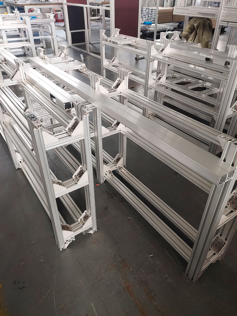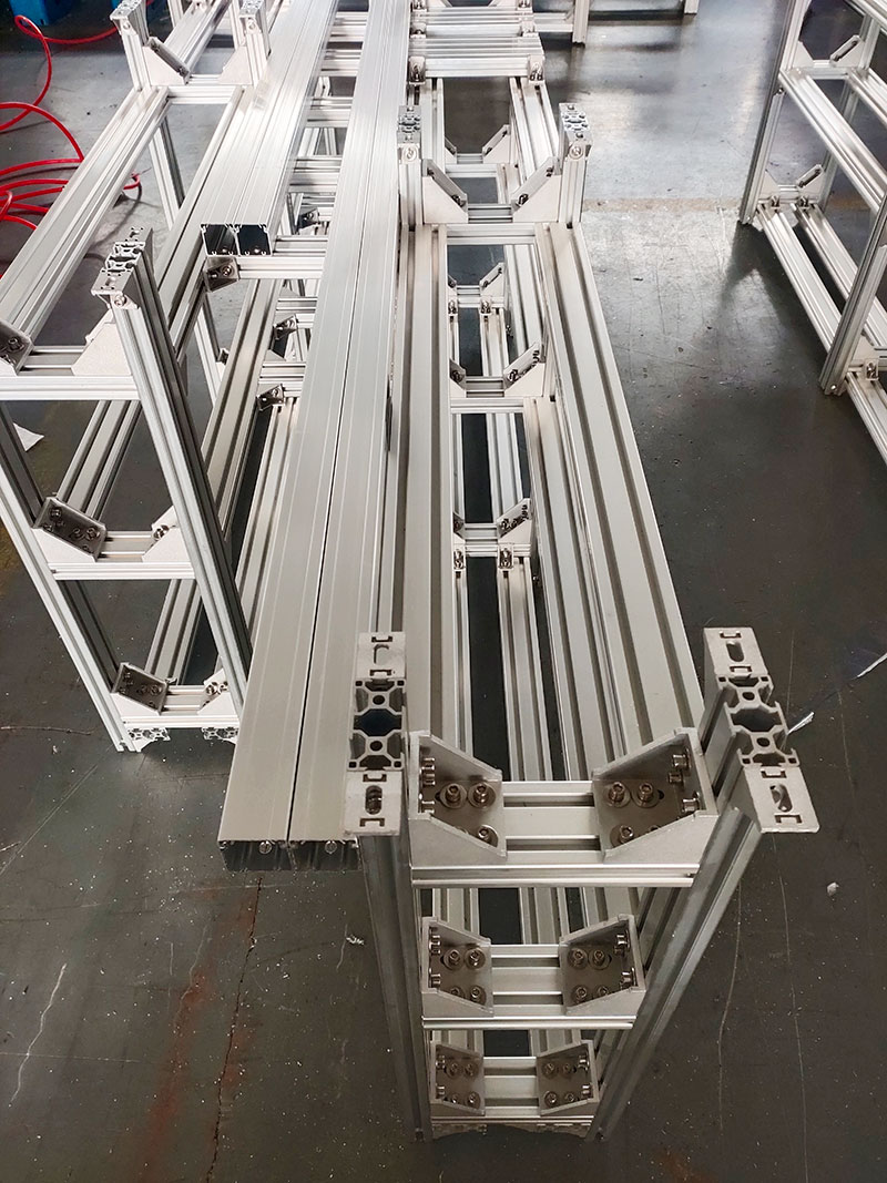 工业铝型材流水线机架的应用场景很多,如电脑装配线、空调装配线、汽车轮胎装配线、手机装配线、化妆品输送线、食品输送线等。不同的应用场景代表不同的输送形式。使用铝型材定制装配线机架可以灵活设计,满足不同工厂车间的使用要求。