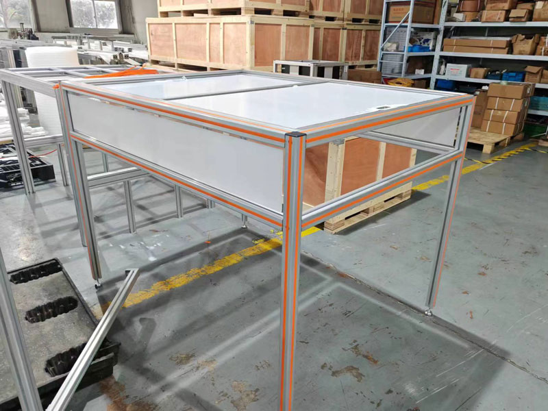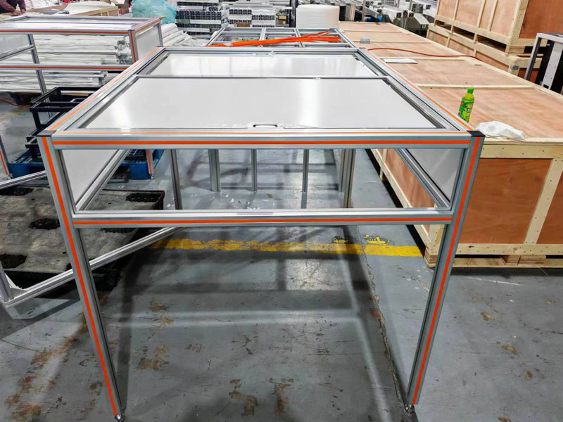 铝型材防护罩是一种以工业铝型材为设备外罩外壳,多见于各种非标机械设备的外罩,各种输送线流水线外罩,大型洁净棚外罩,焊房大型护罩等,能起到区域隔离,静音防尘,保护设备及生产人员安全。铝型材制作的防尘罩的样式有很多,有些是密封的,可以起到隔离噪音的作用,净化车间环境。有些是带有开关门的,不仅可以起到防尘的作用,而且还利于后期维修工作。亚克力板也有透明的,茶色,红色等颜色可以选择。